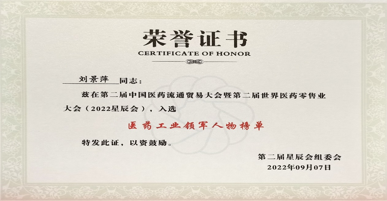 本次星辰会期间,优发国际斩获颇丰,获得多项行业奖项及荣誉。在开幕式上,刘景萍董事长荣获“医药工业领军人物”称号。